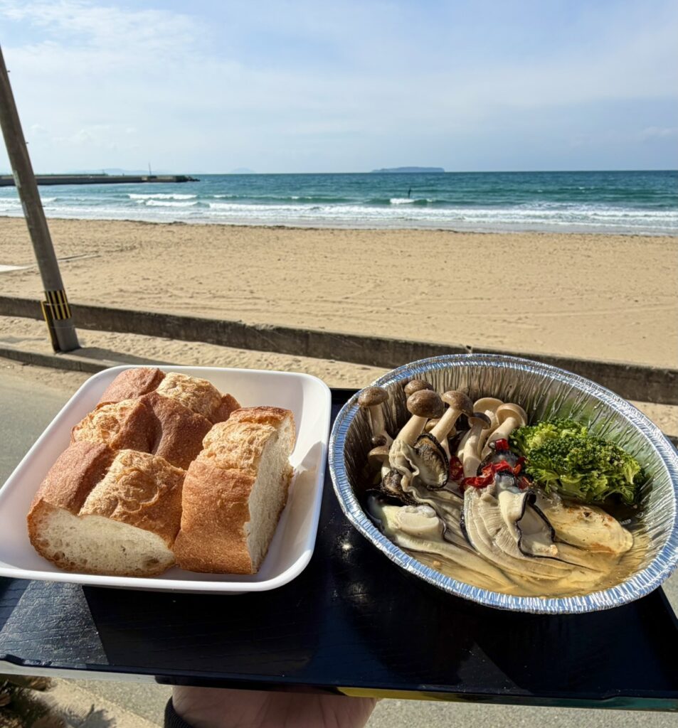 お酒とよく合う人気の牡蠣アヒージョ。福間海岸目の前の、最高のロケーションで最高のひと時を。