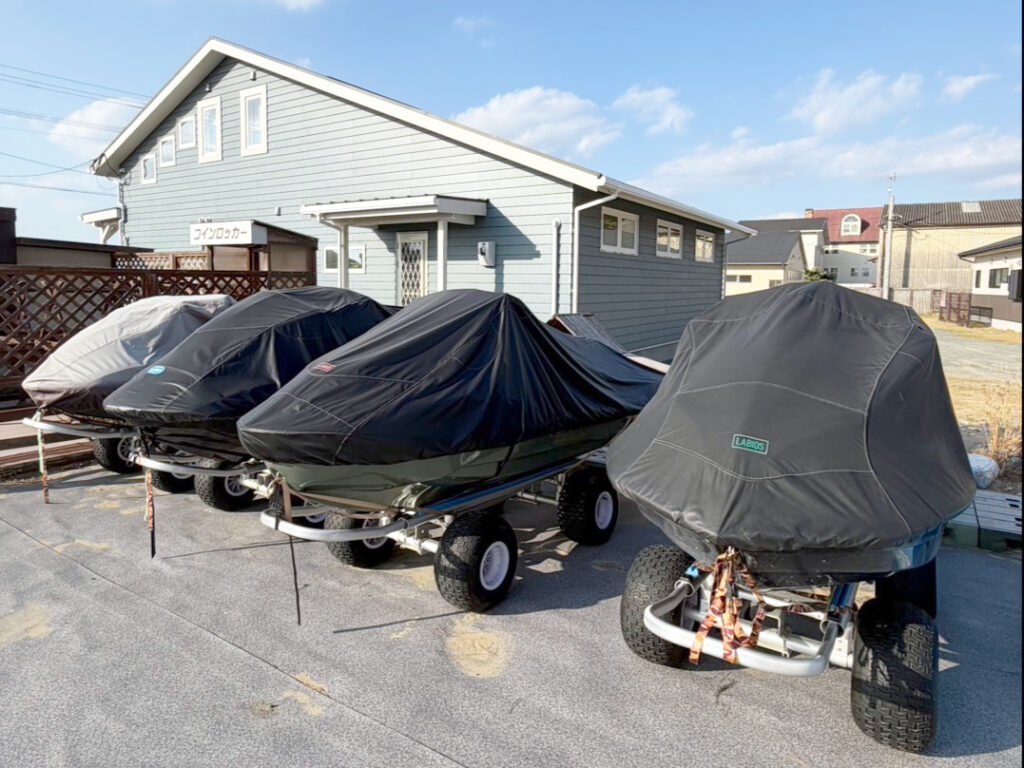 会員制の艇庫です。かっこいいボードがずらりと並んでいます。